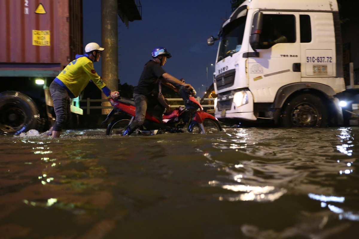 Từ khoảng 16h, đoạn dưới cầu Tân Thuận nước bắt đầu dâng cao. Đến khoảng 17h, triều cường đạt đỉnh, nhiều chỗ trũng thấp ngập hơn nửa bánh xe máy.
