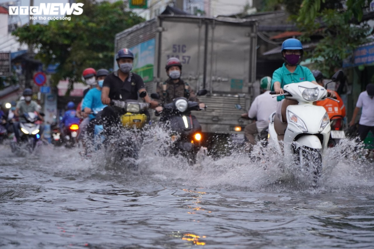 Ghi nhận của PV VTC News, mực nước vùng hạ lưu hệ thống sông Đồng Nai – Sài Gòn lên nhanh đạt mức cao. Trên nhiều tuyến đường như Lê Văn Lương (huyện Nhà Bè), Trần Xuân Soạn (quận 7), Trương Đình Hợi (quận 4)… nước ngập nửa bánh xe, nhiều xe bị chết máy, người dân vật vã dắt bộ về nhà.