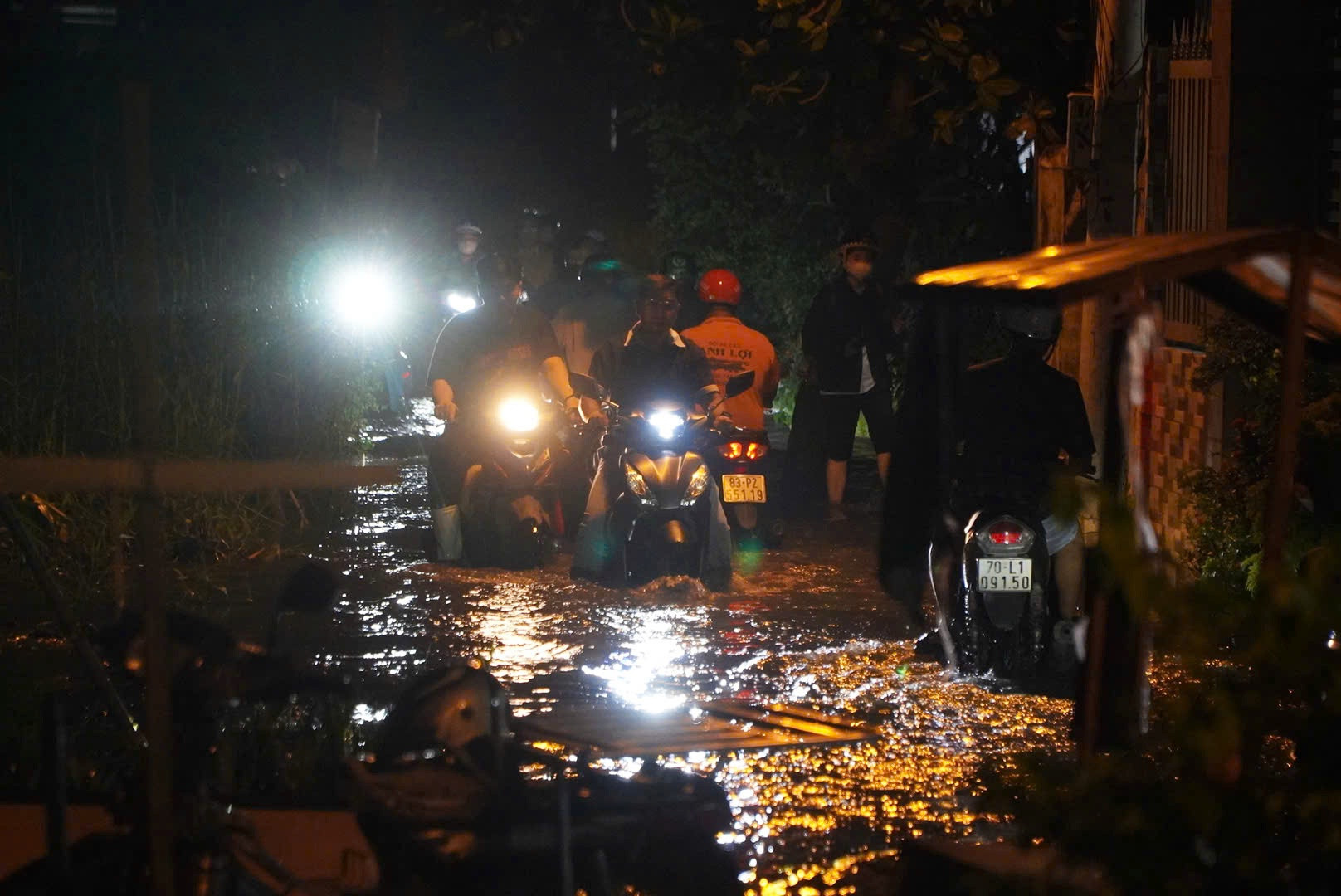 Nước dâng cao nhấn chìm mặt đường kết hợp trời tối khiến việc di chuyển của người dân thêm phần khó khăn.