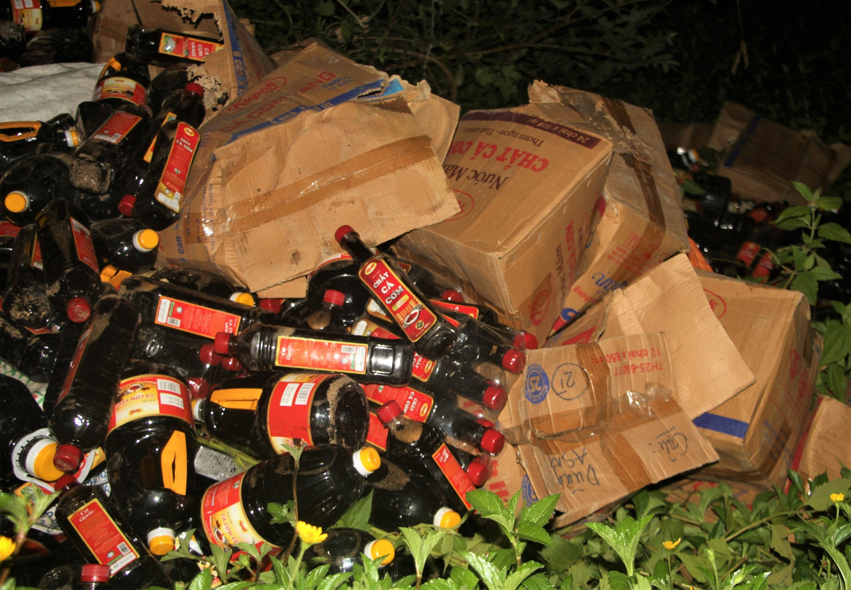 Cả nghìn chai nước mắm bị vứt bỏ trong bụi rậm.
