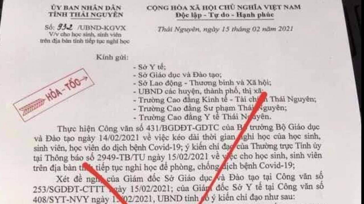 Sáng 16/2, lãnh đạo Sở Thông tin và Truyền thông tỉnh Thái Nguyên cho biết, khoảng 20h30 tối qua (15/2), trên mạng xã hội lan truyền bức ảnh chụp văn bản của UBND tỉnh Thái Nguyên ban hành cùng ngày do ông Vũ Hồng Bắc, chủ tịch UBND tỉnh ký quyết định cho học sinh, sinh viên trên địa bàn nghỉ học để phòng chống dịch COVID-19.