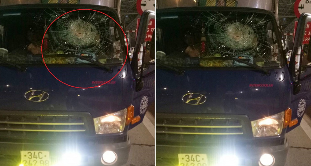 Xe ô tô tải bị nhóm thanh niên ném đã gây vỡ kính khi đang đi trên cao tốc Hạ Long - Vân Đồn.