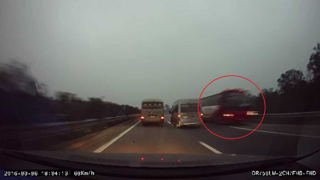 | Chiếc xe khách màu đỏ "liều lĩnh" chạy ngược chiếc tốc độ cao trên cao tốc Hà Nội - Lào Cai (ảnh cắt từ clip) |