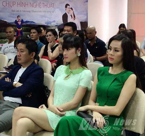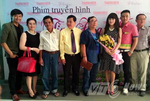 | Hoa hậu Triệu Thị Hà (hàng đầu giữa) trong buổi ra mắt đoàn phim Tình hoa muống biển. Ảnh: Huy Phan |