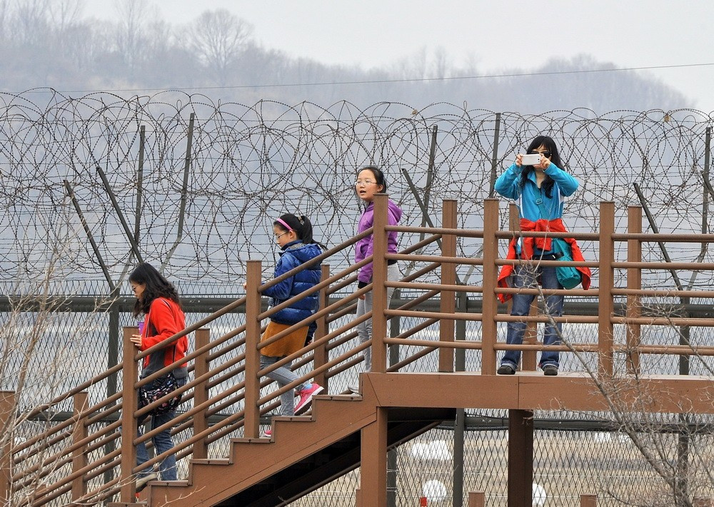 Khách du lịch tham quan Công viên hòa bình Imjingak gần Khu phi quân sự (DMZ) liên Triều, tại Paju, Hàn Quốc, ngày 5/4/2013. (Ảnh: AFP/TTXVN)
