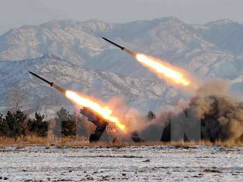| Quân đội Triều Tiên diễn tập bắn tên lửa tại một địa điểm bí mật ở Triều Tiên ngày 5/1/2009 |