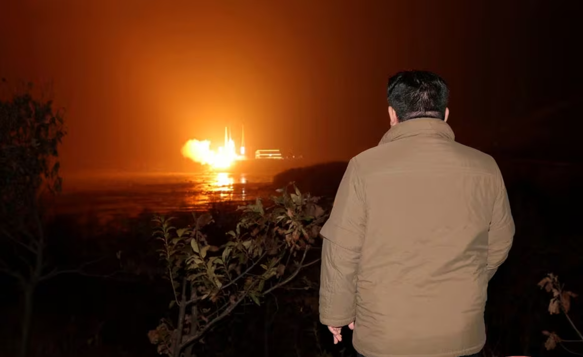 Nhà lãnh đạo Triều Tiên Kim Jong-un theo dõi vụ phóng tên lửa mang theo vệ tinh do thám Malligyong-1 từ bãi phóng ở Tongchang-ri, tỉnh Bắc Pyongan, hôm 21/11. (Ảnh: KCNA)