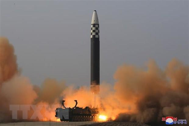 Tên lửa đạn đạo xuyên lục địa Hwasongpho-17 được phóng thử từ sân bay quốc tế Bình Nhưỡng, ngày 24/3. (Ảnh: KCNA/TTXVN)