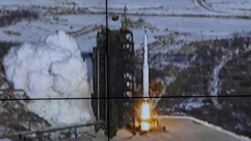 | KCNA công bố cảnh các nhà khoa học Triều Tiên đang làm việc trước màn hình chiếu cảnh tên lửa Unha-3 đang được phóng lên từ huyện Cholsan, tỉnh Bắc Pyongan |