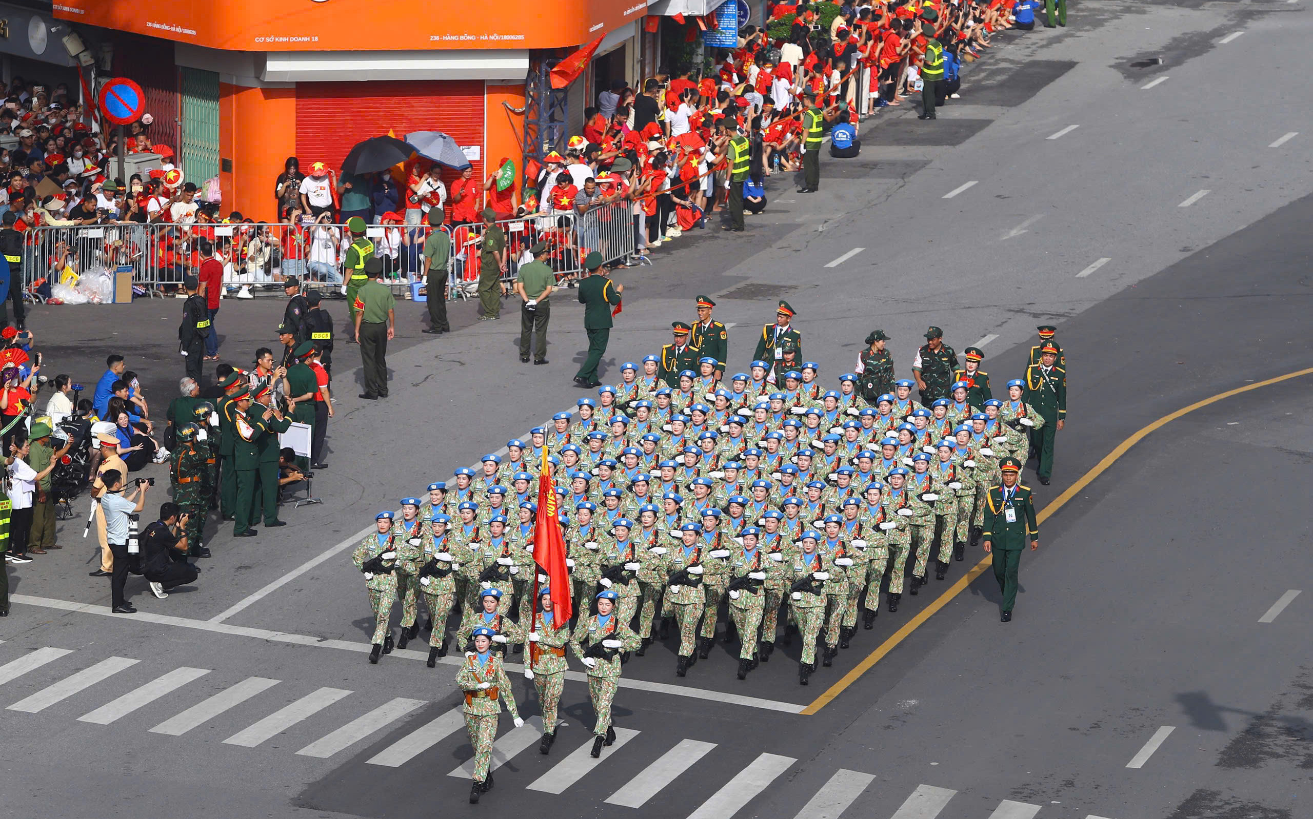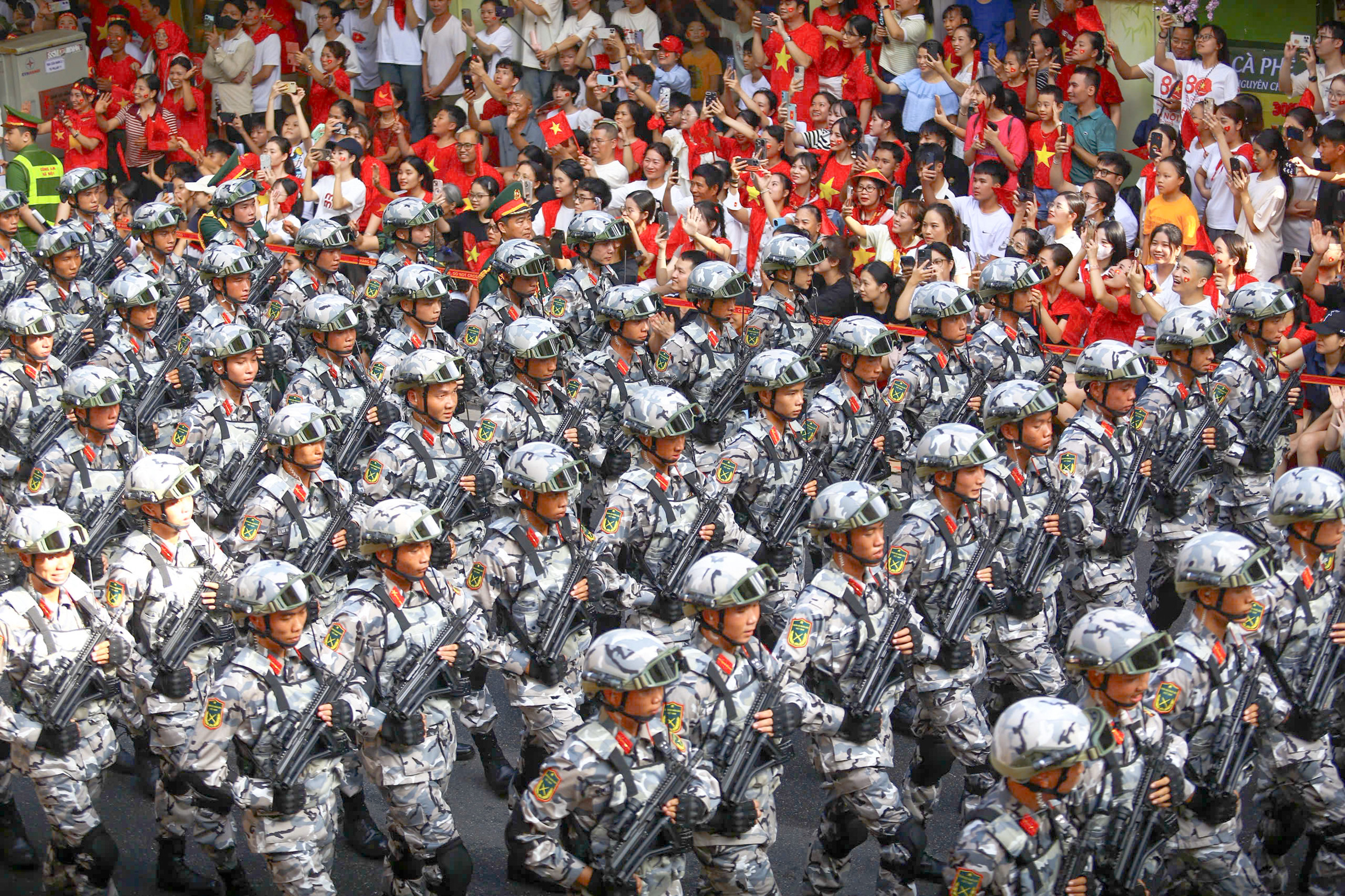 Khi hoàn thành phần diễu binh trên Quảng trường Ba Đình, hơn 40 khối quân đội, công an tiếp tục sải bước hiên ngang trên từng con phố quen thuộc của Thủ đô.