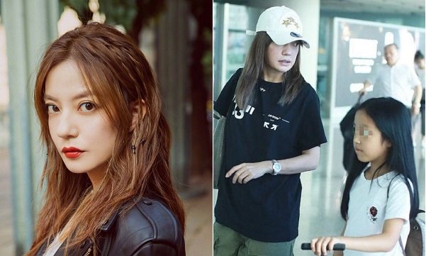 Triệu Vy và con gái Huỳnh Tân ở sân bay.
