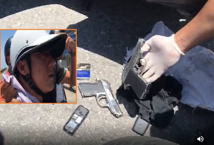 Trần Quốc Tân tại thời điểm bị phát hiện và bắt giữ khi đang mang 2 khẩu súng đi bán.