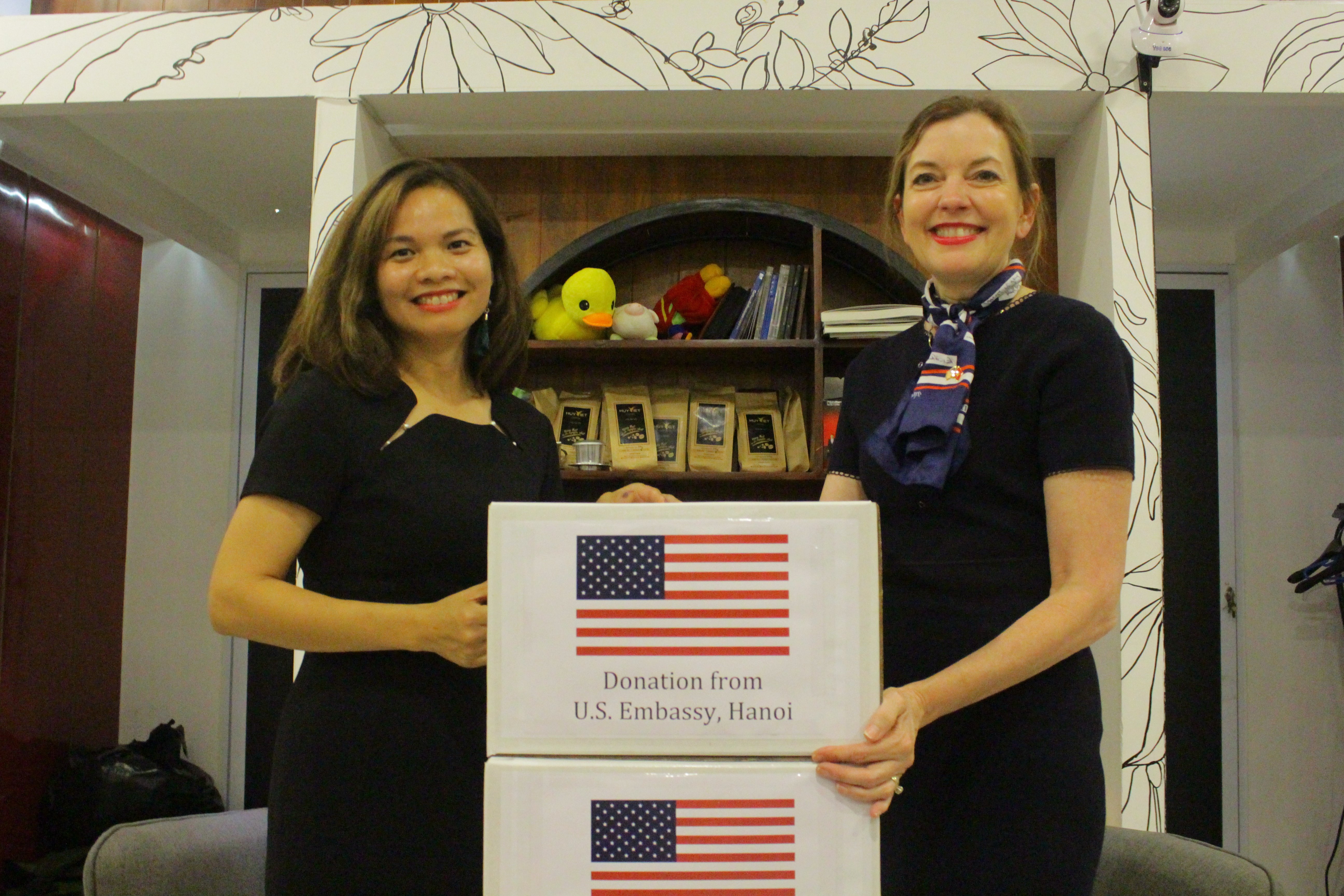 Trợ lý Ngoại trưởng Mỹ trao món quà cho dự án từ thiện PureVN. (Ảnh: Phương Anh)