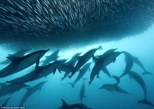 Những con cá mòi tỏ ra vô cùng đoàn kết bằng cách tụ tập thành một khối khổng lồ để chống lại kẻ thù nhưng vẫn không tránh được những cái miệng đang đói.