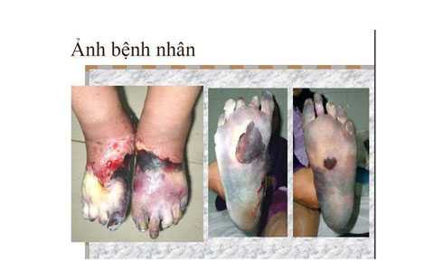 Khi vào bệnh viện khám, các bác sĩ đã phát hiện vết loét hoại tử dưới hạn rõ tiết dịch hôi ở mu hai bàn chân hai bên. Da lòng bàn chân đen, các đầu ngón chi thâm tìm, hoại tử khô và có dát đỏ rải rác ở cẳng chân, đùi, cẳng tay, mu tay.