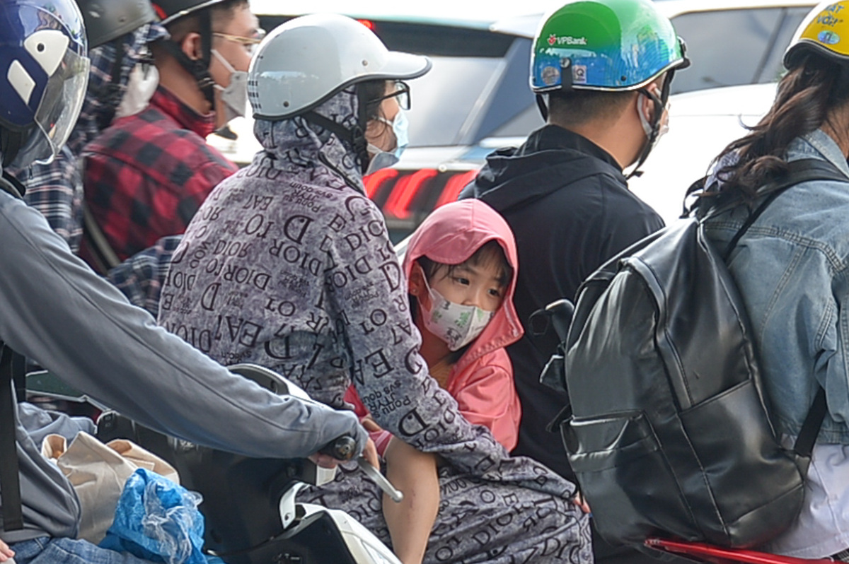 Thời tiết hôm nay nắng khá gay gắt, những gia đình trở lại Hà Nội bằng xe máy trong trang phục kín mít với nhiều lớp tránh nắng.