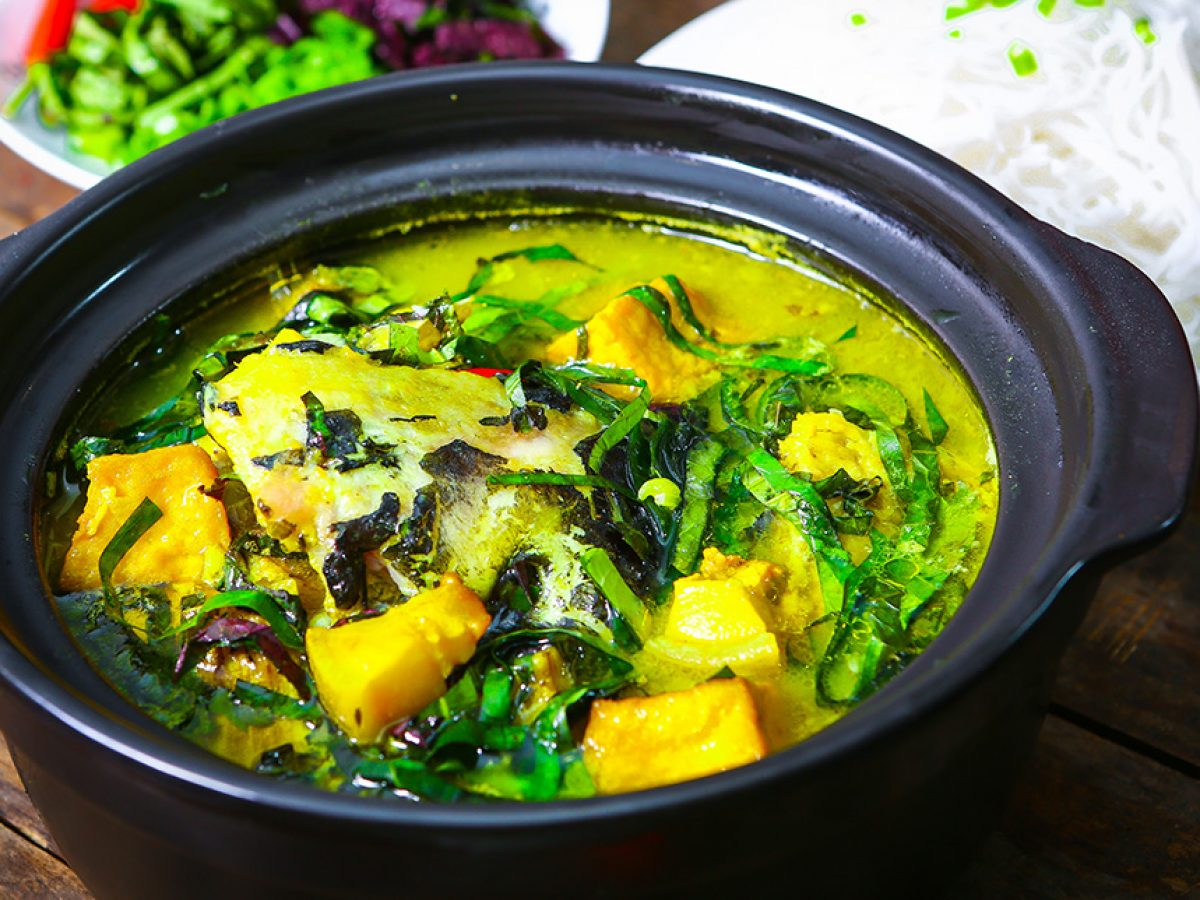 Món này có nguyên liệu là những trái chuối hãy còn xanh, đem đi om với đậu, ốc hay thịt ba chỉ, rắc thêm những loại rau thơm như lá lốt, tía tô là “chuẩn bài”. Nghe qua thì dân dã, đơn giản nhưng lại là món ăn rất đưa cơm.