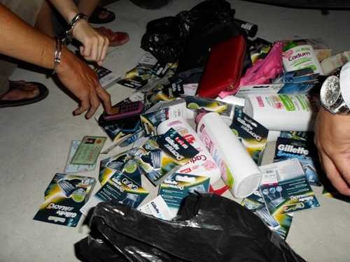 Tang vật thu được 3 điện thoại, 58 cái lưỡi dao GILLETTE trị giá 129.000 đồng/cái, 90 lưỡi dao hiệu GILLETTE Sensorexcel , 8 bình sữa tắm hiệu Cadum, 4 bình xịt thử mùi, 3 bình thuốc nhuộm hiệu bigen Speedy, 2 ví da nữ.