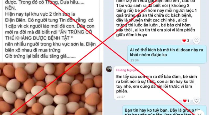 Tháng trước, một người phụ nữ ở Điện Biên đăng tải lên mạng xã hội thông tin trẻ sơ sinh tiên tri ăn trứng luộc loài người sẽ thoát kiếp nạn diệt vong do Covid-19. Người này viết: "Có một bà chị vừa đẻ con ra đứa bé đã biết nói. Bé nói là nếu thế giới này nhà nào không luộc trứng ăn thì sẽ chết hết, mỗi người ăn một quả trứng luộc sẽ thoát kiếp nạn này".