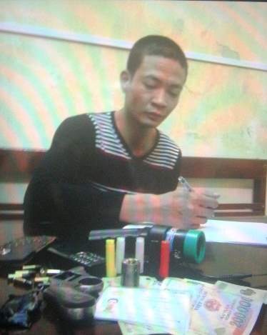 | Phan Duy Khánh cùng súng tự chế và các tang vật khác tại cơ quan công an. Ảnh: M.H |