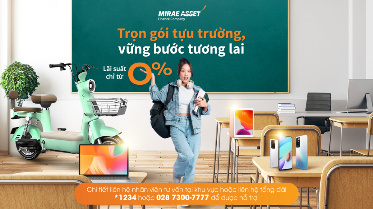 Thấu hiểu áp lực chi tiêu mùa nhập học, Công ty Tài chính Mirae Asset mang đến chương trình “Trọn gói tựu trường – Vững bước tương lai” với ưu đãi lãi suất chỉ từ 0% tùy sản phẩm, kỳ hạn vay lên đến 36 tháng. Điểm cộng nổi bật là quy trình xét duyệt nhanh chỉ trong 5 – 10 phút, thủ tục đơn giản, khách hàng chỉ cần Căn cước công dân để thực hiện hồ sơ.