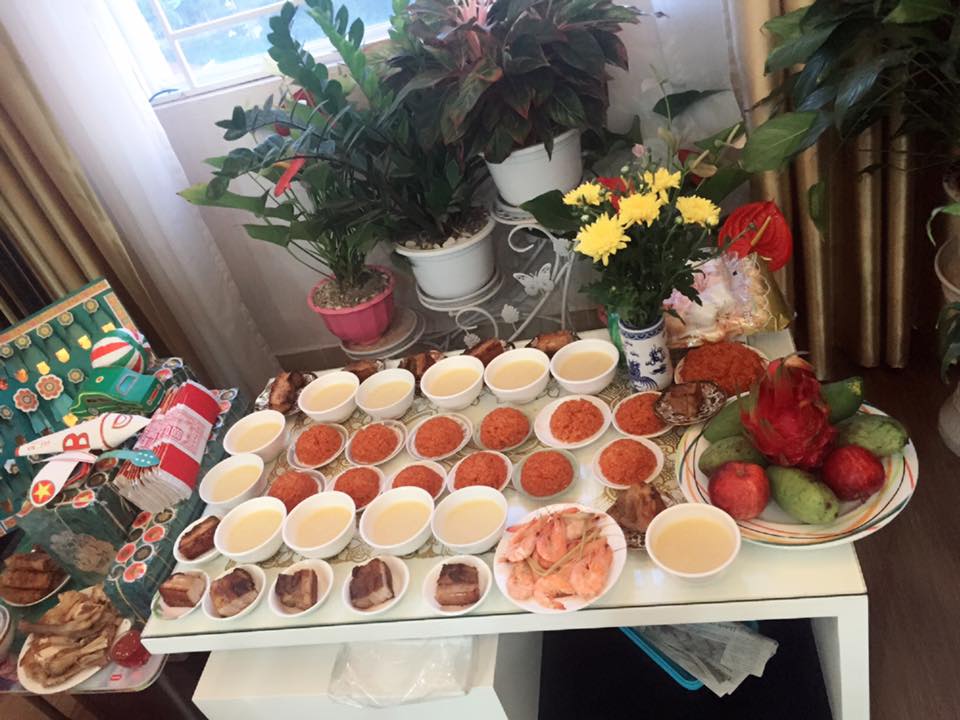 Điều khiến mâm cỗ cúng mụ của chị Quỳnh Lan trở nên đặc biệt là vì nhìn nó rất chỉn chu, gọn gàng và đẹp mắt cho dù vẫn đầy đủ tất cả các loại hoa quả, bánh trái theo yêu cầu. “Gia đình mình ở Vũng Tàu, hai vợ chồng ở riêng chứ không ở chung. Lễ cúng mụ là hai vợ chồng tự tìm hiểu, lên kế hoạch, chuẩn bị và đặt lễ. Dù là lần đầu nhưng trong quá trình làm lễ, cũng không gặp khó khăn hay lúng túng gì cả”, chị Quỳnh Lan chia sẻ.