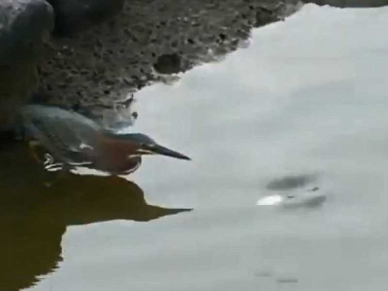 Chú chim diệc thông minh cắp một mẩu bánh mì nhỏ rồi thả xuống nước để dụ cá đến ăn.