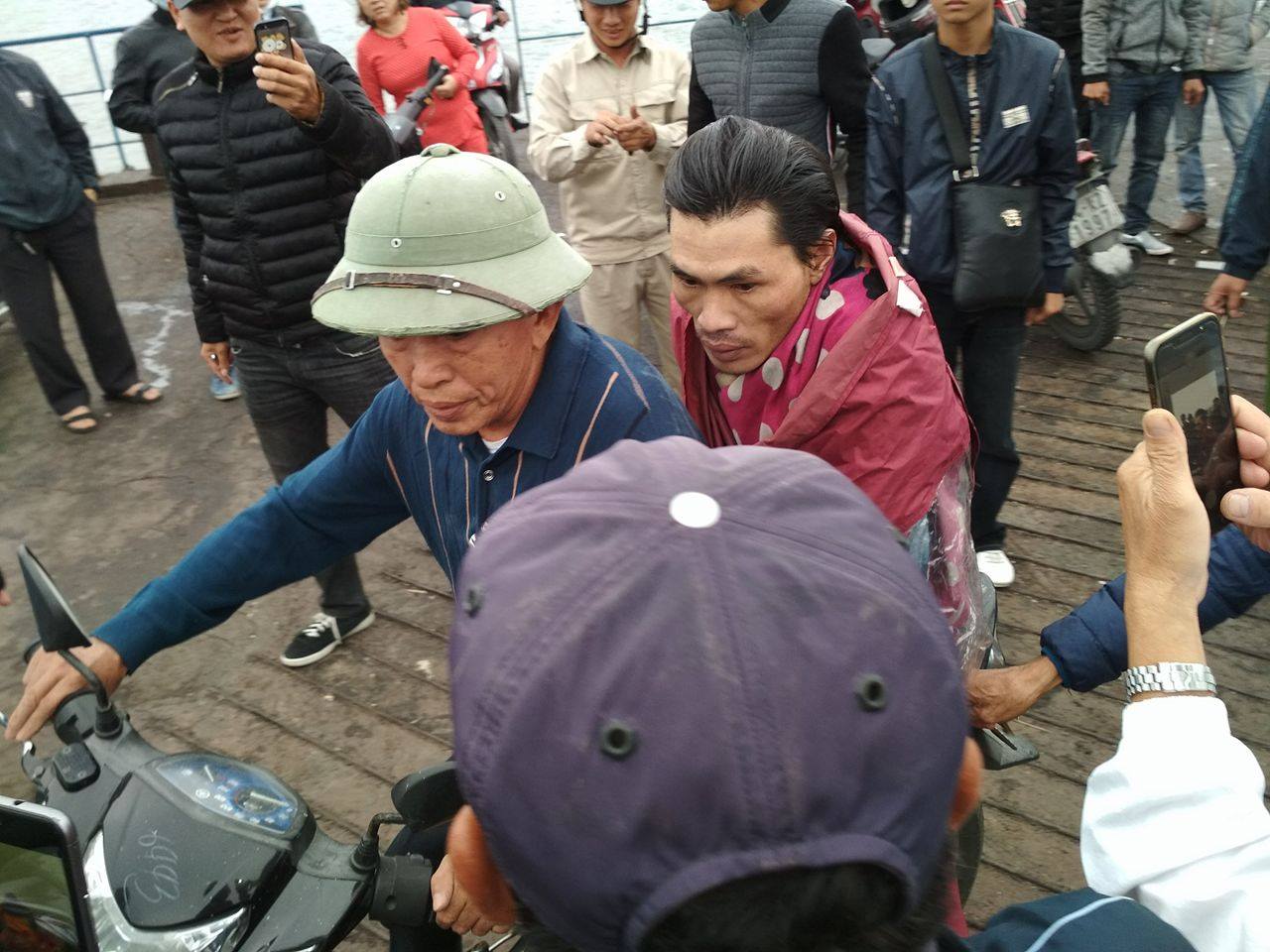 Người đàn ông (mặc áo mưa đỏ) đã may mắn được người dân cứu sống khi nhảy từ cầu Bãi Cháy.