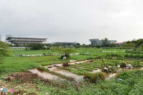 Trên khu đất 4,2 ha, các hộ dân là chủ ruộng trước đây đã quay lại trồng đủ loại hoa màu. Bà Mai (Phú Đô, quận Nam Từ Liêm) đang tưới nốt những luống rau cuối ngày. Do nằm ở vùng đất trũng, bà Mai cùng nhiều hộ canh tác khác chỉ cần đào hố trong mùa cạn là có nước. Mùa mưa, việc trồng rau càng nhàn hơn do không lo thiếu nước. Nhờ mượn lại đất dự án để trồng rau, mỗi tháng bà Mai có thêm khoản thu nhập hơn 2 triệu đồng.