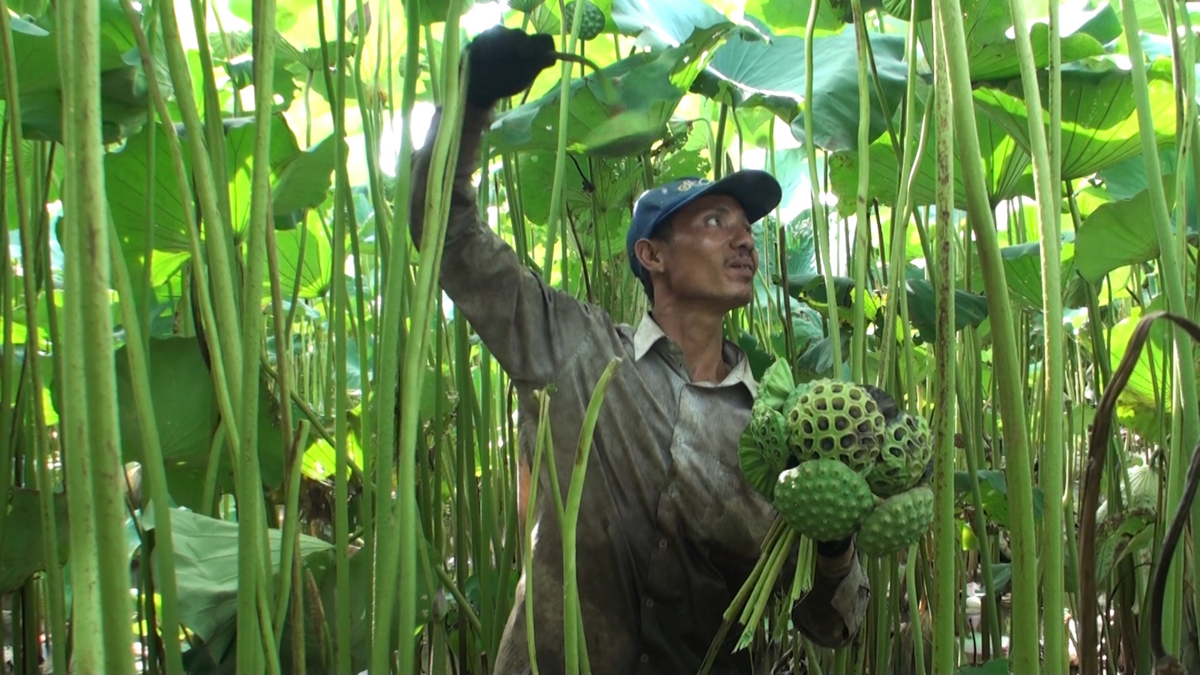 Anh Phạm Văn Ngọc (Duy Tiên, Hà Nam) trồng hơn 10 mẫu sen “khổng lồ” để lấy hạt, mỗi vụ thu hoạch mang về cho gia đình anh cả trăm triệu đồng.
