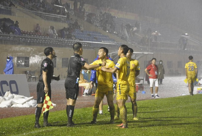 Cầu thủ Nam Định phản ứng trọng tài bác bàn thắng hợp lệ trận gặp Quảng Nam.