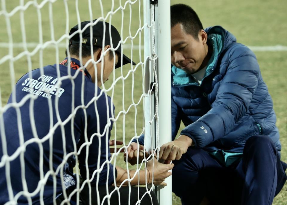 Mắc lưới khung thành của thủ môn Văn Lâm trước hiệp 1 bị bung ra. Ảnh: LH.