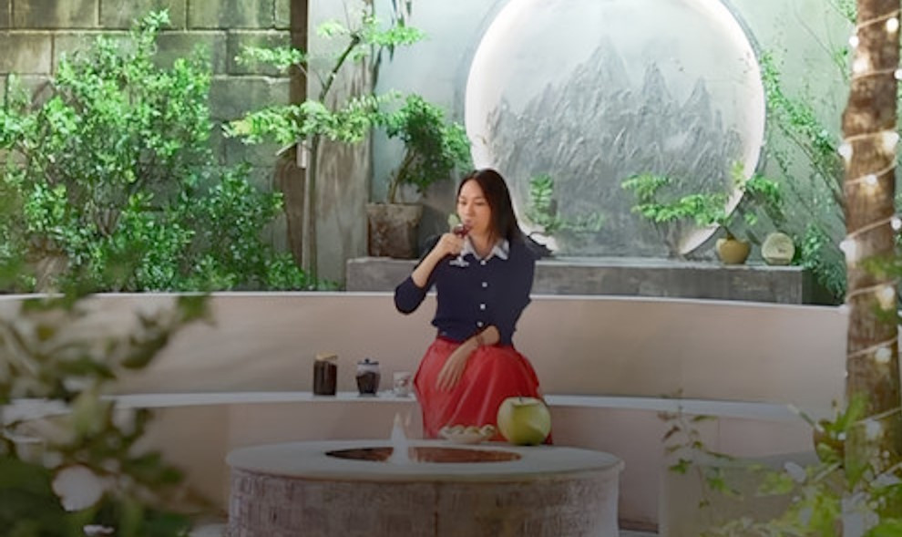 Một góc vườn, cô đặt bàn làm nơi ăn, thưởng trà, rượu hoặc mở tiệc cùng gia đình, người thân và bạn bè ngoài trời. Góc này được giăng dây đèn lung linh, phía sau treo tranh tròn tráng gương điện tích hợp đèn LED.