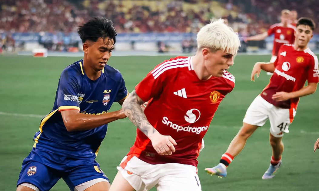 Kakang Rudianto (bên trái) kèm Garnacho trong trận đấu với Man Utd.
