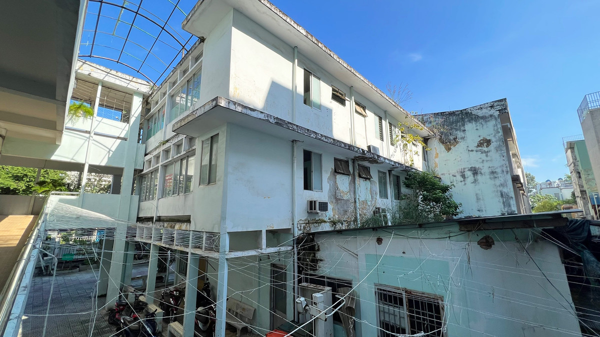 Khu A-B gồm 1 trệt, 2 lầu cũng xuống cấp nghiêm trọng; sê nô thoát nước mái bị thấm dột, tường bao và tường ngăn các phòng bị thấm, bung tróc.