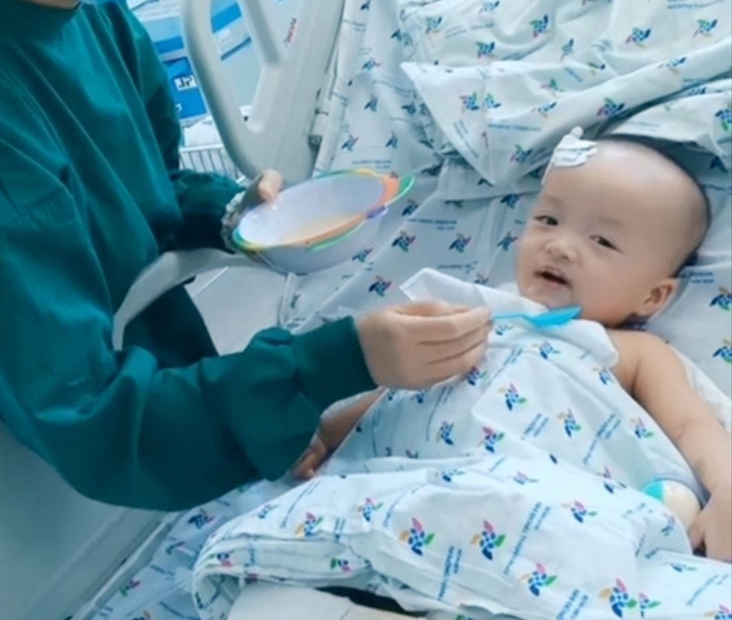 Song Nhi háo hức ăn những muỗng cháo đầu tiên sau ca mổ. (Ảnh BVCC)