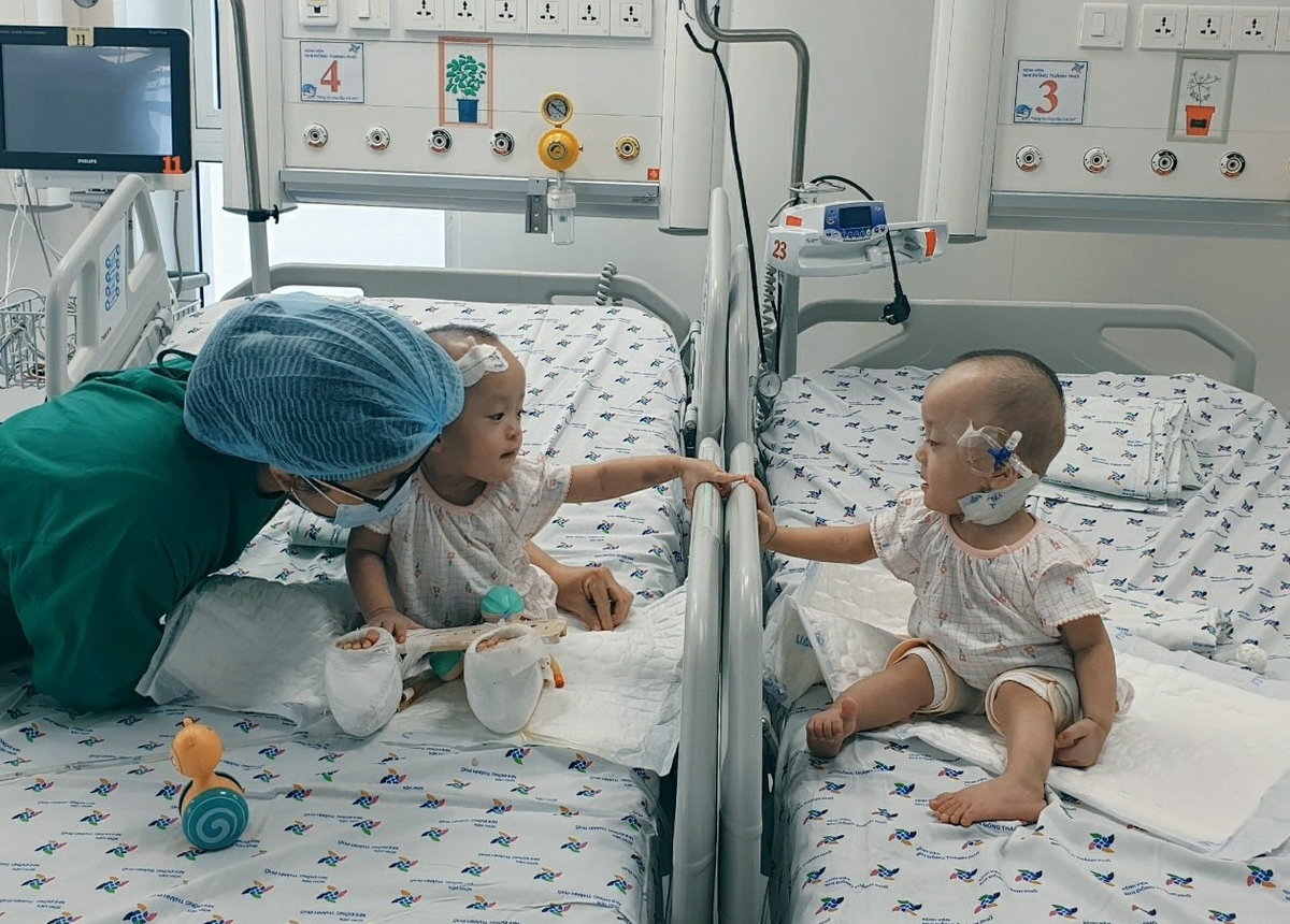 BV Nhi đồng TP.HCM vừa cho biết, sau hơn 1 tháng phẫu thuật, tình hình kiểm soát nhiễm trùng ổn định, nên các bác sĩ đã kéo giường lại cho 2 chị em được gần nhau hơn. Trước đó, 2 bé được giãn cách xa nhau điều trị theo liệu trình chống nhiễm trùng riêng .
