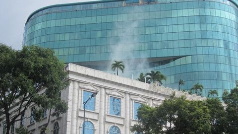 | Những nạn nhân còn mắc kẹt ở tầng thượng của tòa nhà đang kêu cứu trong đám khói trắng (ảnh: P.T) |