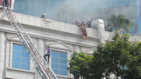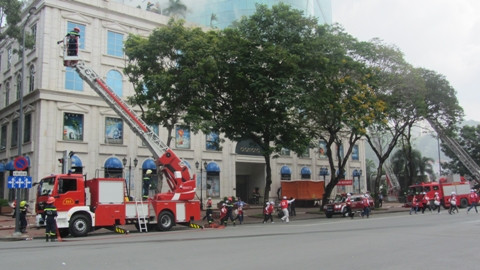 Dòng người từ tòa nhà Diamond plaza được sơ tán khẩn cấp sau khi có khói phát ra (ảnh: P.T) Những người bị thương do bị ngạt khí nhanh chóng được đưa đi cấp cứu (ảnh: P.T) Hàng chục xe chữa cháy chuyên nghiệp được điều động có mặt tại hiện trường (ảnh: P.T) Lực lượng y tế có mặt để cứu chữa nạn nhân (ảnh: P.T) Xe thang chữa cháy hiện đại đến hiện trường giải cứu nạn nhân bị mắc kẹt trên cao (ảnh: P.T) Nạn nhân đang được xuống bằng thang (ảnh: P.T) Một nạn nhân khác được giải cứu bằng ống trượt (ảnh: P.T) Một số nạn nhân khác thì trượt xuống bằng thang dây của lực lượng chữa cháy (Ảnh: P.T)