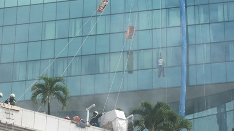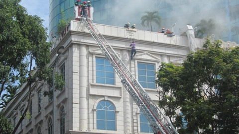 | Trực thăng được huy động đến để giải cứu các nạn nhân ở tầng cao nhất của tòa nhà (ảnh: P.T) |