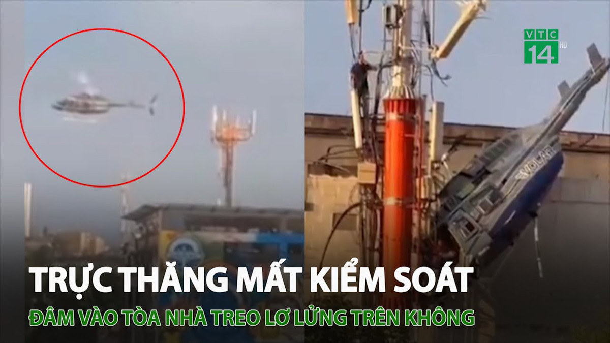 Trực thăng mất kiểm soát tông vào tòa nhà, treo lơ lửng trên không