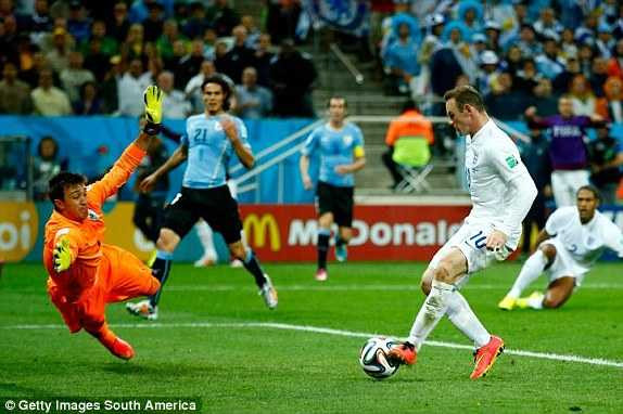 32' BÓNG CHẠM XÀ NGANG. Rooney lẳng lặng lẻn ra sau hàng phòng ngự Uruguay, bật cao đánh đầu nhưng do ở cự li gần, bóng lại bay trúng xà ngang. Cũng phải thừa nhận, pha sút phạt mà Gerrard thực hiện rất hay, bóng đi cong liệng, loại bỏ toàn bộ phán đoán từ những cái bóng áo xanh.