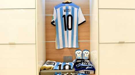 | Phòng thay đồ của Argentina. Messi và các đồng đội cũng ra sân với trang phục truyền thống. |