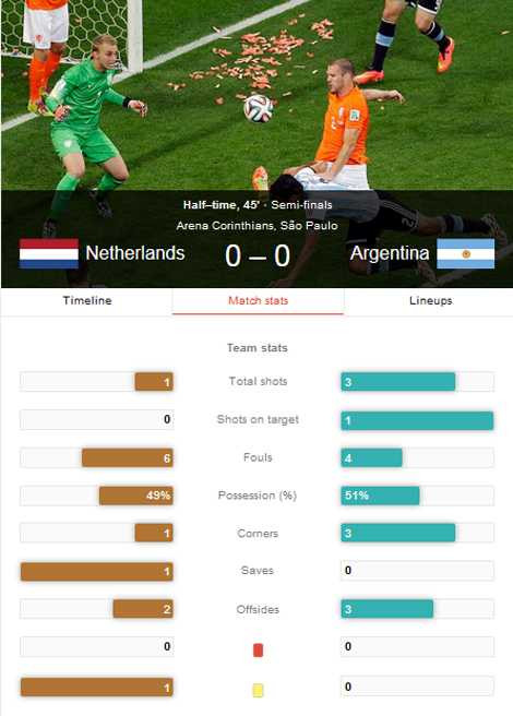 30': Độc giả đang theo dõi bài thường thuật trực tiếp trên Báo điện tử VTC News trận bán kết 2, World Cup 2014 giữa Hà Lan và Argentina. 2/3 thời gian của hiệp 1 đã trôi qua, tỷ số trên sân đang là 0-0. Hai đội đã và đang thi đấu rất kín kẽ cùng thời gian kiểm soát bóng ngang bằng nhau.