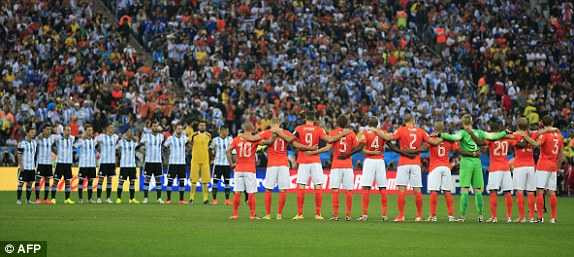 3H: Hai đội cùng dành một phút mặc niệm để tưởng nhớ huyền thoại bóng đá người gốc Argentina, Alfredo Di Stefano, cầu thủ vĩ đại của Real Madrid vừa qua đời hôm thứ Hai ở tuổi 88. Stefano từng khoác áo ĐT Argentina, Colombia và cả Tây Ban Nha nhưng ông chưa một lần dự World Cup.