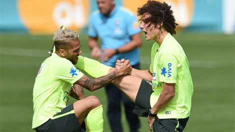 | Các cầu thủ Brazil tập luyện chuẩn bị cho trận đấu. Trong ảnh là Dani Alves và David Luiz. |