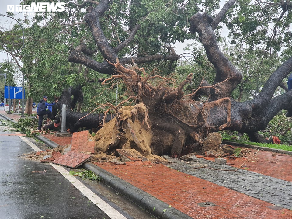 Bão số 13 quét qua khiến nhiều cây xanh trên một số tuyến đường ở TP Huế gãy đổ, đáng chú là cây xà cừ cổ thụ nằm trên đường Trần Hưng Đạo ngay gần cầu Phú Xuân bị gió bão đánh bật gốc.