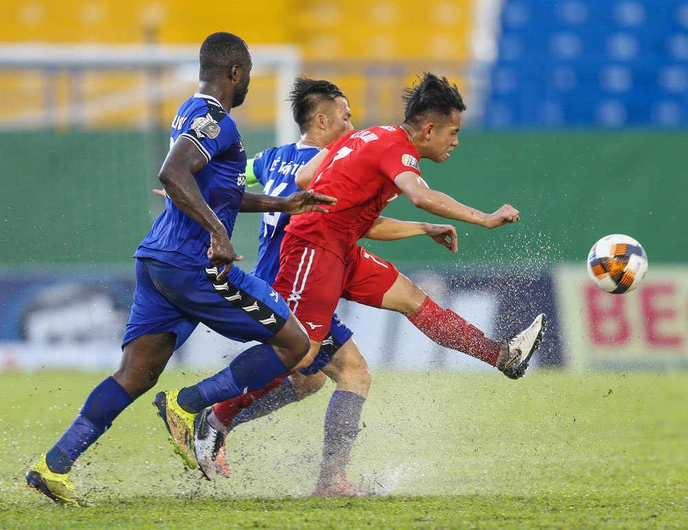 | 5' HAGL chủ động chơi với đội hình thấp, ý đồ phòng ngự phản công là rất rõ ràng. Mặt sân sũng nước khiến các cầu thủ gặp khó khăn trong những tình huống xử lý bóng sệt. |