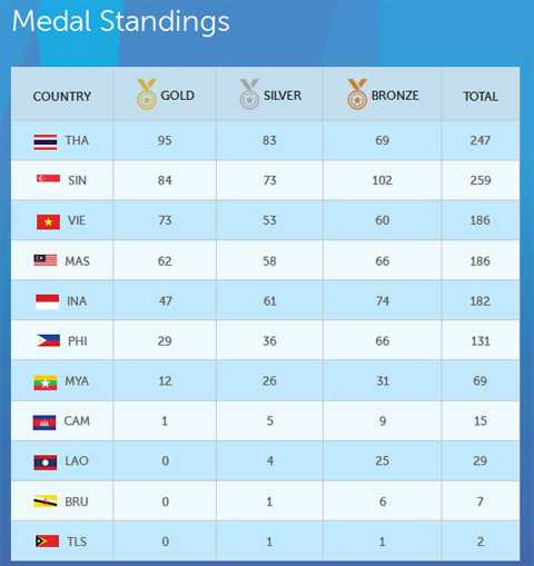 Báo điện tử VTC NewsChủ đề của buổi lễ bế mạc là tôn vinh và tình bằng hữu. Kết thúc SEA Games, Thái Lan dẫn đầu toàn đoàn. Đoàn Việt Nam vượt chi tiêu với 73HCV trong đó có hơn 80% đến từ các môn thể thao Olympic.