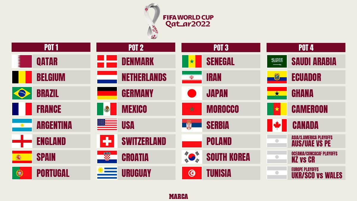 - Nhóm 1 gồm chủ nhà Qatar và 7 đội bóng đứng đầu bảng xếp hạng FIFA tháng 3/2022: Brazil, Bỉ, Pháp, Argentina, Anh, Tây Ban Nha, Bồ Đào Nha.